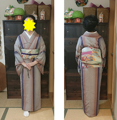 灰色に紫や桃色の縞がはいったアンティーク着物。